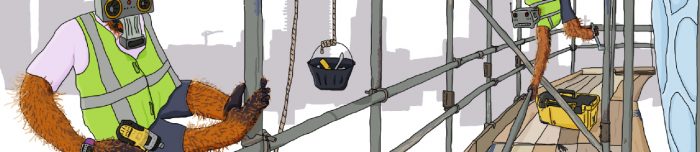 “In this day and age you want your scaffolding erected by professionals, and there aren’t better experts than our oran-bot-ans. Stop monkeying around and call us today for a special discount!”, reads the advertisement for “Monkey Business Cooperative”, the leading scaffolding company in the city.